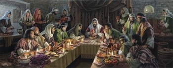 This is a Passover feast. Some may call it the Last Supper. Jesus is about to show his cup and say, “This is my blood, which is shed for you.” Several near him are praying.